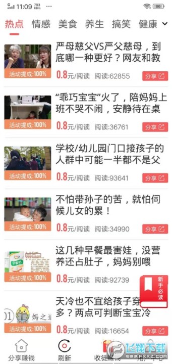2、软件上每天更新新闻、美食、健康等文章,转发至微信,好友点击,坐等收益;