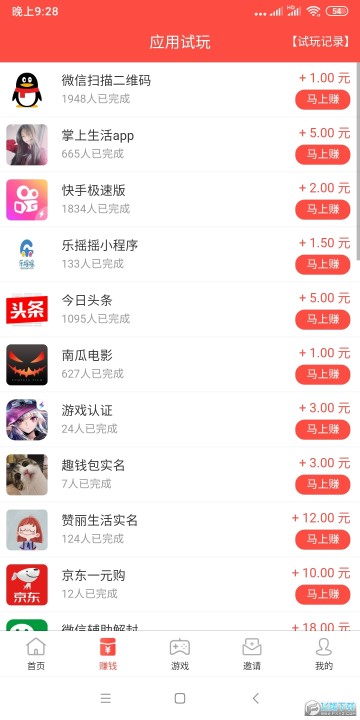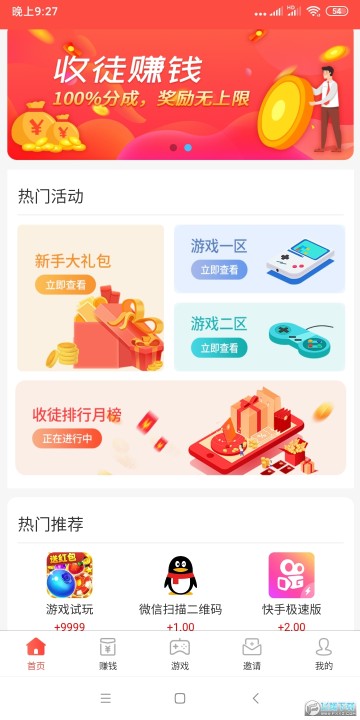 一、赚钱:游戏一区、游戏二区、热门推荐、应用试玩(下载指定任务APP);