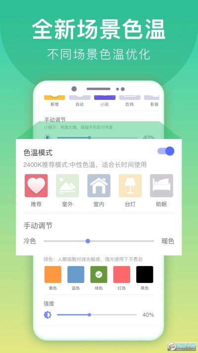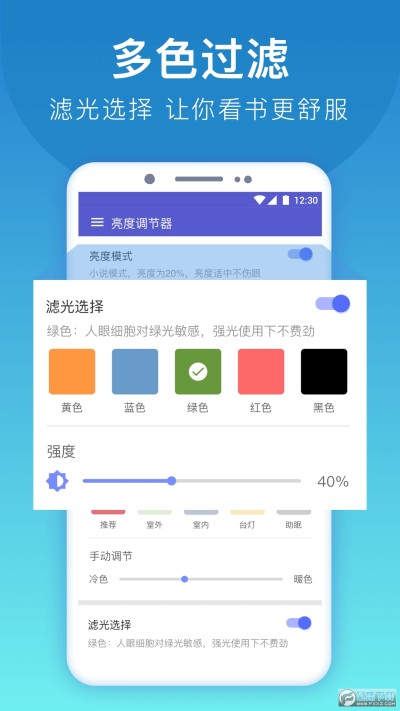 ●滤光调节:不同情境下,过滤不同光线。读书更轻松,护眼更专业,手机必备护眼宝