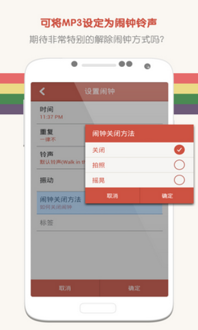 - 设定你想要在哪个地方关闭闹铃。