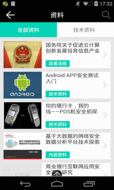 • 安全资料—涵盖信息安全行业七大主要资料类型:技术资料、产品资料、解决方案、安全标准、政策法规、培训认证、内部资料。所有安全资料随时随地在线查询。