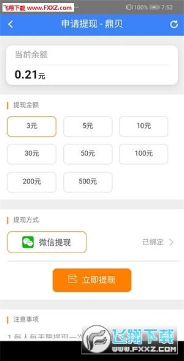 - 一键授权微信即可提现,满3元可首次微信提现,后续5元起,当天到账