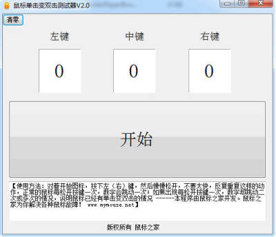 鼠标移至软件的“开始”区域中,按下左(右)键之后慢慢地松开,多次重复这样的动作就可以测试鼠标是否出现单击变双击的问题。