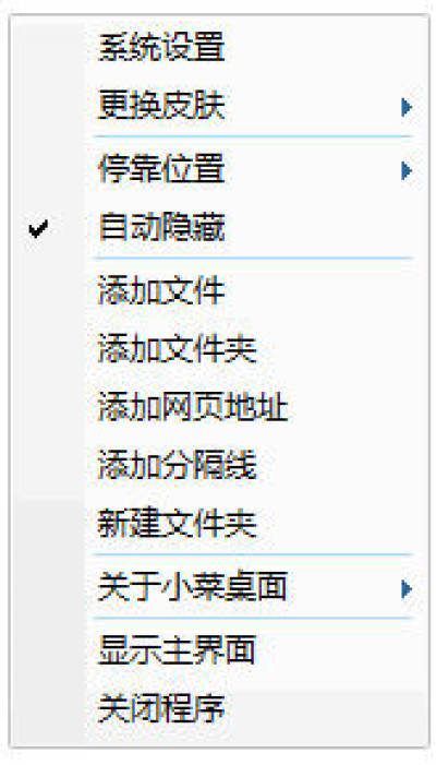 可以拖动桌面上的任意图标到小菜桌面,也可以把图标拖到小菜桌面之外进行删除,而且小菜会自定贴边隐藏,可以停靠在屏幕的上下左右四个方向,不占用桌面空间。
