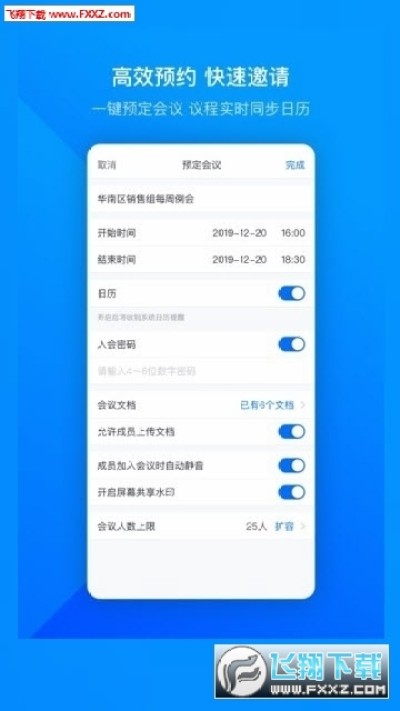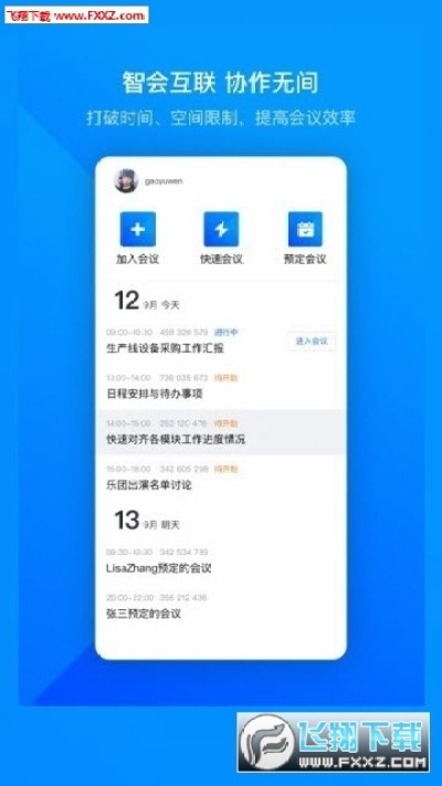 - 界面清爽简洁,一键预约、发起、加入会议;