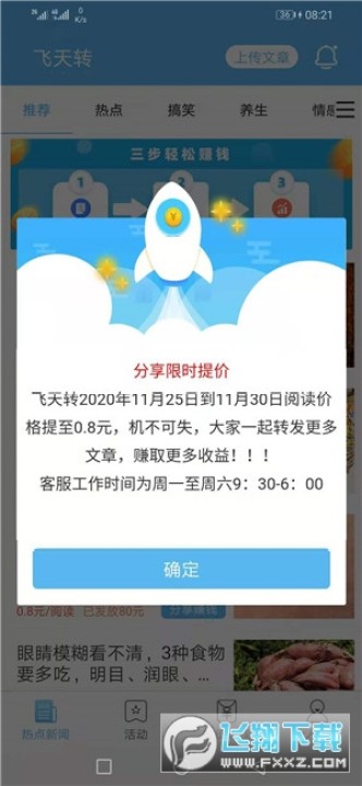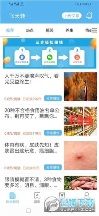 1、飞天转转发平台只需三步轻松赚钱,点击分享文章-分享到微信-坐等收益,转发一篇文章,每当好友阅读一次,即可获得0.8元