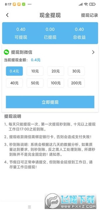 4、飞天转首次满0.4元提现,之后满10元起提现到微信,每天只能提现一次