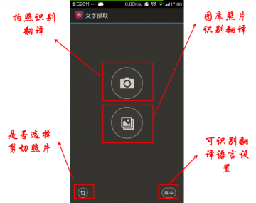 主界面包括拍照识别翻译、是否选择剪切照片、图库照片识别翻译、可识别翻译语言设置