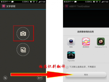 设置完毕后点击拍照识别翻译按钮,照相机图示按钮,并选择相机