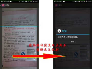 如果被拍摄物体位置不正或不清晰很容易导致无法识别