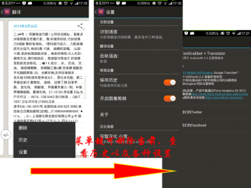点击菜单键可对当前识别翻译内容删除,也可查看之前的翻译历史,还可以进行各种设置
