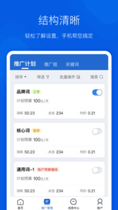 1、支持投放管理:实时查看各投放层级的物料信息,随时调整各层级投放设置,包括预算、投放地区、启用/暂停、出价等,助力把控营销推广。