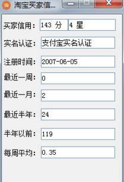 淘宝买家信誉检测是一款简单易于使用专门针对淘宝卖家查询买家信誉查询的软件。这款软件非常强大,它可以批量查询淘宝、天猫的买家最近一周、一月、半年、半年之前的信用点数,以及淘宝号的类型、注册时间、是否实名认证等,是卖家必备的工具。有了这款软件你就再也不用担心,遇上黑心买家了。