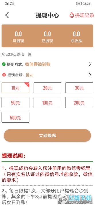 2、在麋鹿网上面赚取的奖励永久满10元可申请提现,门槛低,到账快,支持微信方式提现