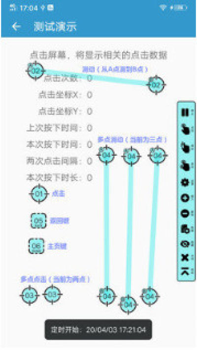 支持功能:点击、地图点击、疯狂点击、滑动、多点同时点击或滑动、定时启动、随机时间、插入或删除指定步骤、保存和加载配置等。后续版本会逐步完善,增加功能