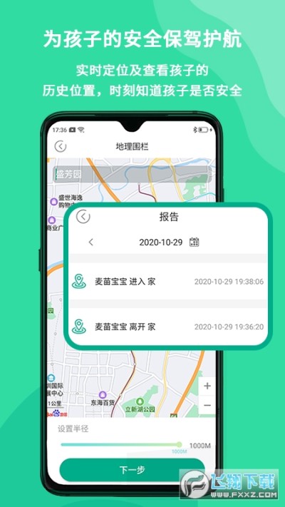 实时追踪 + 地理围栏:可以实时查看孩子的位置,还可以设置安全区域,App里面孩子有进/出入的报告可看,并且孩子进/出入该区域有短信通知,以防孩子丢失,保证安全。