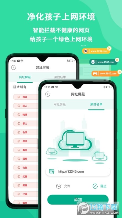 净化孩子上网环境+网址屏蔽:科学智能拦截不良网址,让含有不良信息网站无缝可入,还可以自定义网址黑白名单,灵活方便。