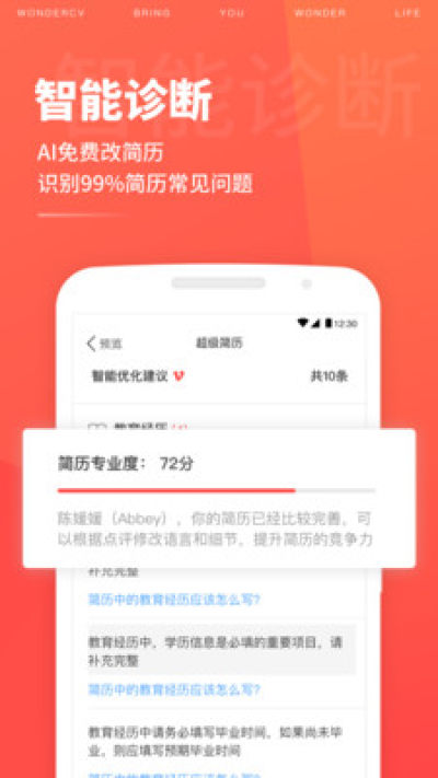 超级简历WonderCV提供各行业中英文简历模板免费下载和真人大牛简历范文参考,是HR推荐的智能简历制作工具.还有专业简历案例库和智能简历优化建议,以及大量简历制作攻略和职场攻略.是免费制作名企,外企,500强等高薪职位求职简历和留学简历必备的精英简历神器.