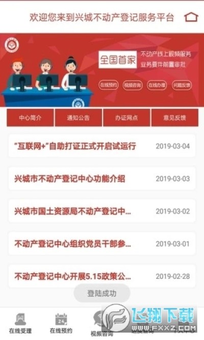 兴城不动产app主要用于老百姓办理房地产相关业务,应用主页包含了中心简介,通知公告,办证网点,意见反馈等功能,用户可以在在线受理中申请需要办理的前置业务,如果未验证身份,首先需要进行人脸识别,并与注册时的信息进行比对,验证成功后即可办理业务。如果已经验证过则不需要进行验证,提交后的业务在进度查询中可以查看。如果用户对办理业务不了解,可以进行视频咨询。用户可以通过在线预约功能进行提前预约,避免现场办理业务时长时间排队等候。