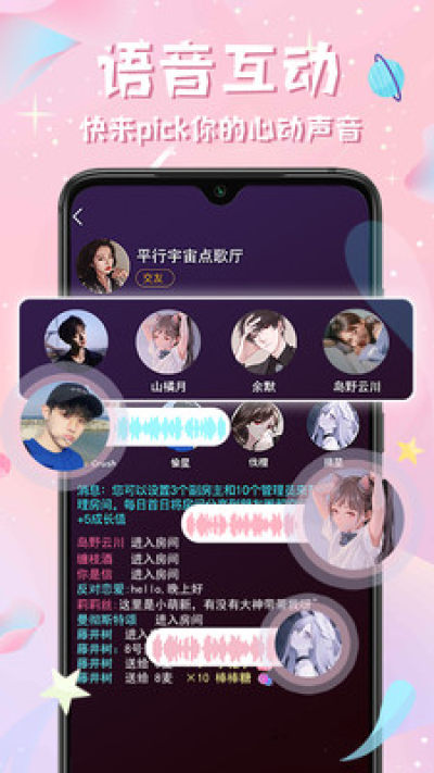 4、24小时海量用户在线,发送文字消息、语音、图片互动,进行交友互动各种多人聊天室开启,语音连麦,还能一起在线K歌!
