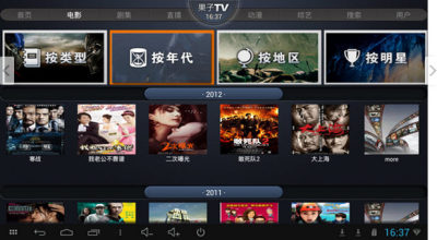 全新的HDPFANS Android TV客户端,全面更名为果子TV,适配99%以上的TV遥控器,所有操作只需7个键,上下左右、确定、返回加房子键。放弃鼠标吧,电视机上不也应该有老鼠。果子TV它本身没有视频资源,但它却又拥有大量资源;聚合了优酷、土豆、PPS、奇艺、乐视、搜狐、CNTV等国内大多数的视频网站内容。