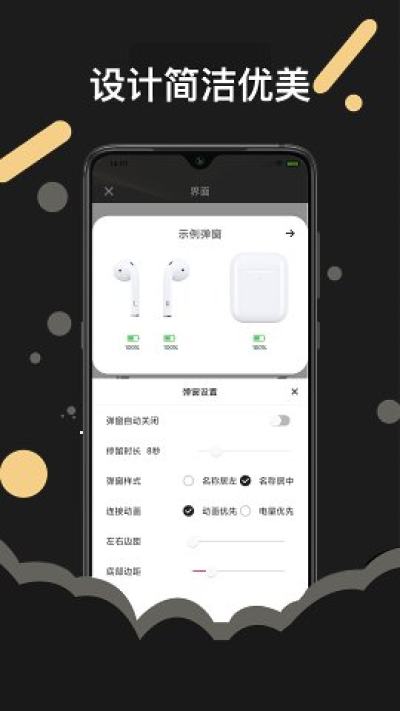 2、清楚精确的显示你耳机左耳以及右耳的剩余百分比电量,还有充电盒的电量显示;