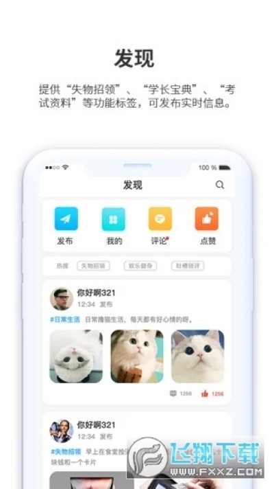 提住“失物招领”、“学长宝典”、“考试资料产等功能标签,可发布实时信息。