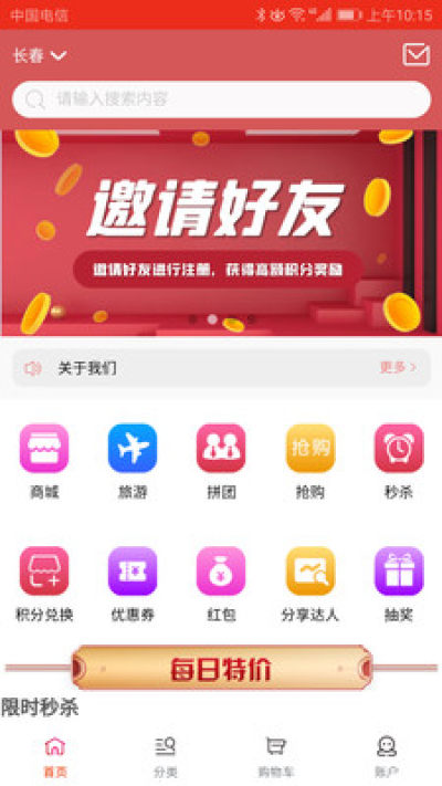 首页为用户展示一些精品的内容,涵盖商城、旅游、拼团、秒杀等等;