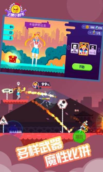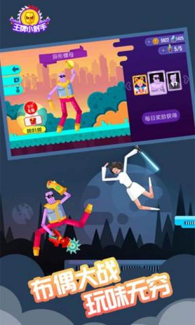 《王牌小射手》是一款疯狂2D横版多人射击对战游戏。采用布偶系统,玩家在各路奇葩陷阱中进行决斗,无比刺激,趣味无穷!在游戏中,玩家可以选择心仪的卡通角色,与机器人或者随机匹配的玩家进行对抗,射击击败对手。游戏对战时,会掉落各种有趣的武器等你拾取体验。光剑、齿轮飞镖或是大铁锤,都会成为你击败敌人的最强工具。当然还有着各种其他的道具等你来发现并升级使用哦!