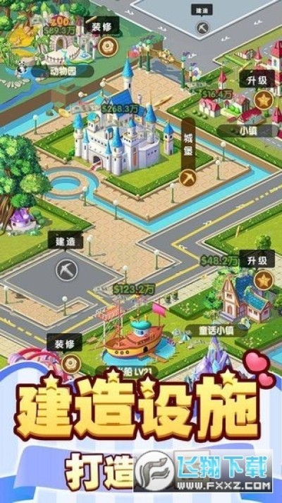 2、游戏的操作简单容易上手,还有着多样的玩法和挑战等待着你,玩家将建设自己的童话游乐园,不断的招募更多的员工。