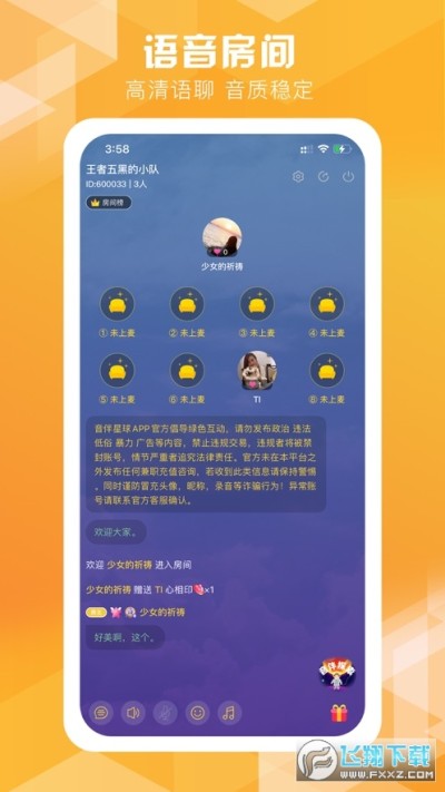 【语音交友】有趣的聊天室,可以与多位主播同时在线进行互动,让聊天充满乐趣,不再是单一模式,可以为你带来更多的乐趣。还能选择喜欢的声音主播,在线进行交流互动,关注喜欢的主播,随时查看最新动态,开心交友。