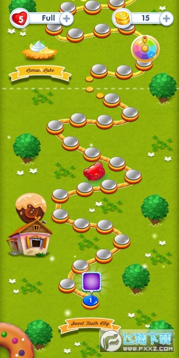 3.简单模式的糖果消除挑战,在一个欢乐的小镇中探索,去发现地图中的宝藏,消消作战有无限的快乐。