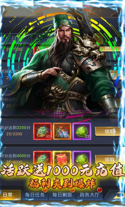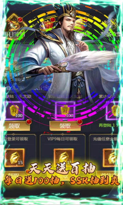 1.上线送V16,38888元宝,高阶武将曹仁,创角就送千元充值卡礼包!