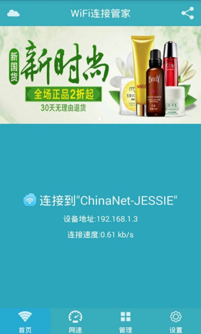 WiFi连接管家主要用于检测网络速度和查看当前用户在同一WiFi局域网的设备信息,防止蹭网。