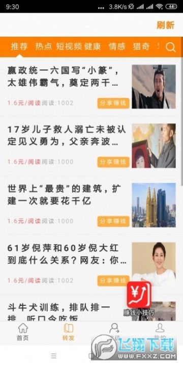 3、高达十几个不同的资讯分类,应有尽有,将您看到的优质资讯转发到微信或者朋友圈,获得好友点击即可赚取现金收益。