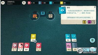 默认开局,玩家手里会有健康health、激情passion和推理reason各一张,少量金钱fund。