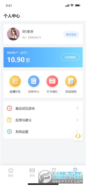 我的:我的页面主要展示用户的基本信息,以及进行一些签到、分享、建议反馈、系统设置、设置个人信息等操作。