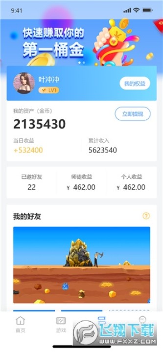首页:用户可以在这个页面查看自己的资产情况,首页还展示了APP推荐的高额任务、游戏赚钱、平台奖励,三种任务信息。