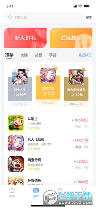 游戏:游戏页面主要用于对APP中的游戏进行分类展示,本页面中的游戏分为推荐、快赚、益智、手游、其他。用户也能在这个页面查看自己最近试玩的游戏以及新人好礼和试玩教程。