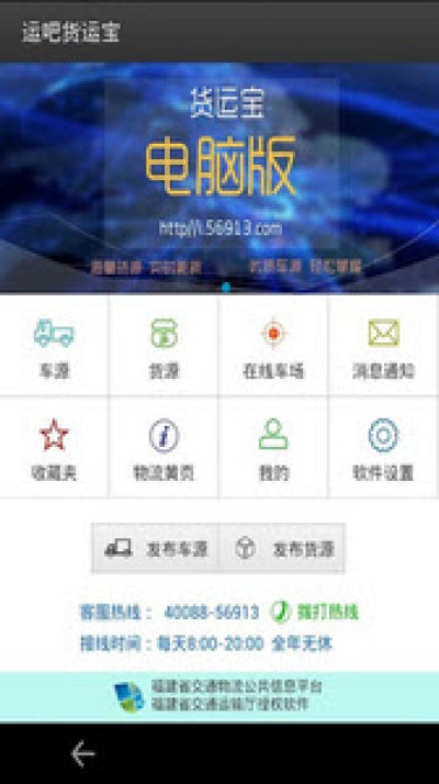 用户随时随地发布或找到自己适合最新的车源、货源信息。该软件为物流企业和个体车主提供了运力发布、车辆定位、查找货源、查找物流园区、运政审核、车辆年审申报、车辆二级维护申报、诚信评价、车队管理、运力调度等功能和服务;为货主企业提供了在线交易、运单生成、在线监控、车源查找、诚信评价。