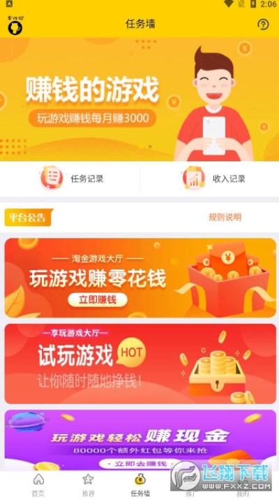 1.登录首页游戏赚钱页面或者在任务墙页面选择游戏大厅进入