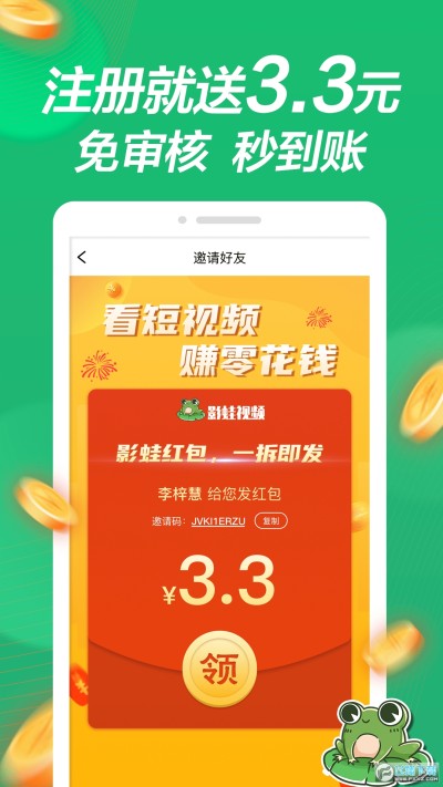 影蛙视频赚钱版app是真的能赚钱吗?安全吗靠谱吗?影蛙视频赚钱版app是一个刷短视频就能赚现金的软件,福利还是非常多的,注册就送现金红包,无需审核,直接提现到账,还经常有红包雨活动哦,每天福利享不停。