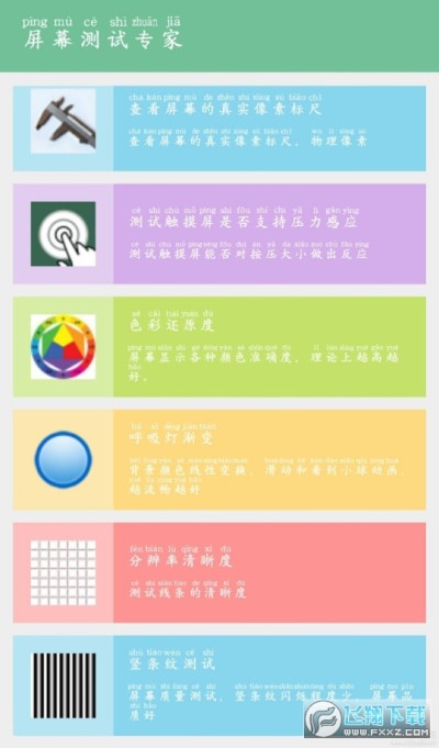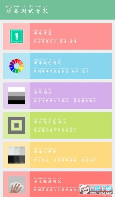 屏幕测试专家是一款能够帮助大家测试手机屏幕的软件,共有17个屏幕测试项目,功能比较全面。全范围检测屏幕触摸是否正常,颜色是不是正常,有需要的小伙伴赶紧下载吧。