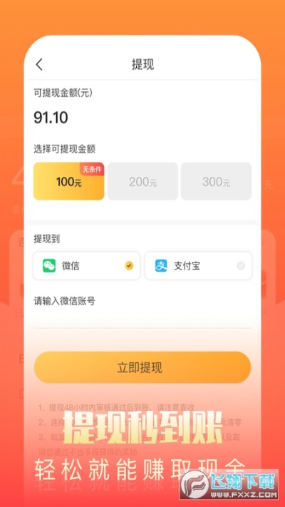 5、提供两种提现方式,分别是微信和支付宝,自选提现方式,极速提现;