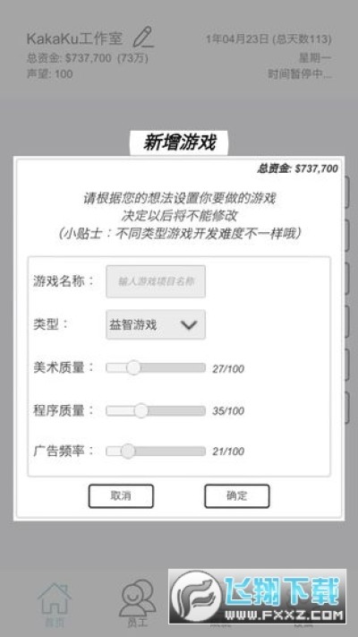 在本游戏中,玩家将扮演一名独立游戏开发者:通过做游戏,然后在游戏内部置入广告赚钱养活自己(包括自己建立的工作室)!!!那么你该如何取舍呢?你会选择“用爱发电”吗?