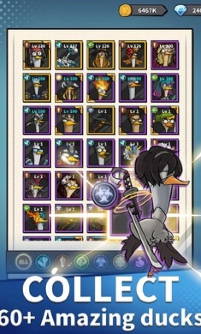 在这个神奇的世界中,你将会带领一群鸭子进行冒险。旅途上碰到的敌人也会越来越强大,需要你不断地升级鸭子们的等级,提高他们的作战力。