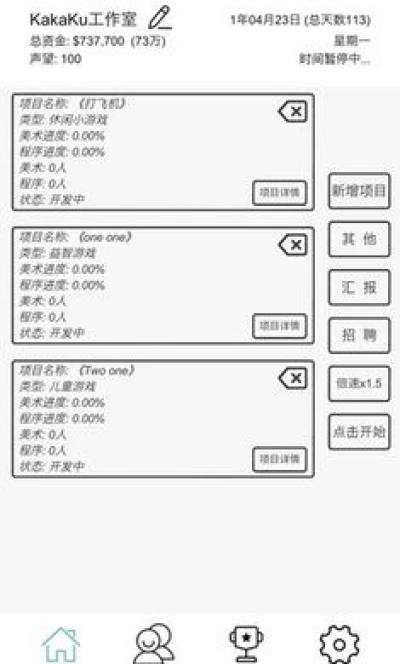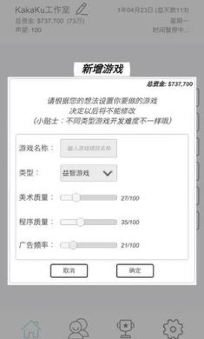 在本游戏中,玩家将扮演一名独立游戏开发者:通过做游戏,然后在游戏内部置入广告赚钱养活自己(包括自己建立的工作室)!!!那么你该如何取舍呢?你会选择“用爱发电”吗?