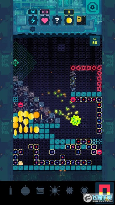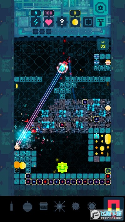 2、战略性地使用8种不同类型的炸弹,以清除道路并避免被上升的障碍物淹没。