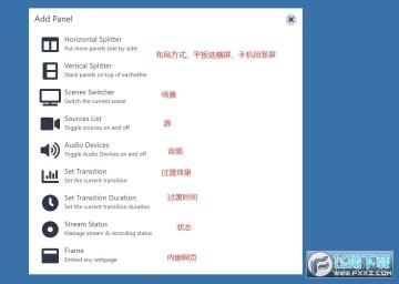 点击场景进行切换,点击源控制源显示和隐藏,滑动控制声音,点击设置过渡效果和持续时间
