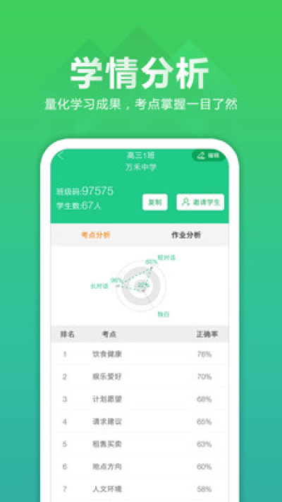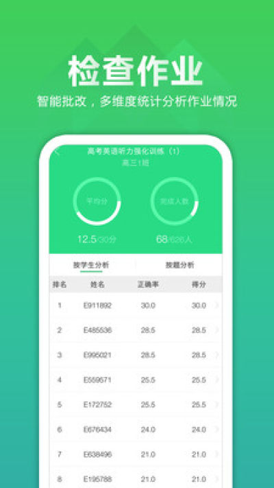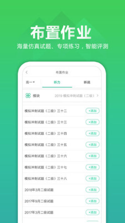 听力百分百APP教师端是一款辅助英语老师教学工具,特邀北大教授及一线名师命题、高考主播录音;语音纯正,题材新颖,紧扣高考;老师可以创建班级、一键布置作业、学习数据智能分析,学情一目了然;让老师教学更有效。